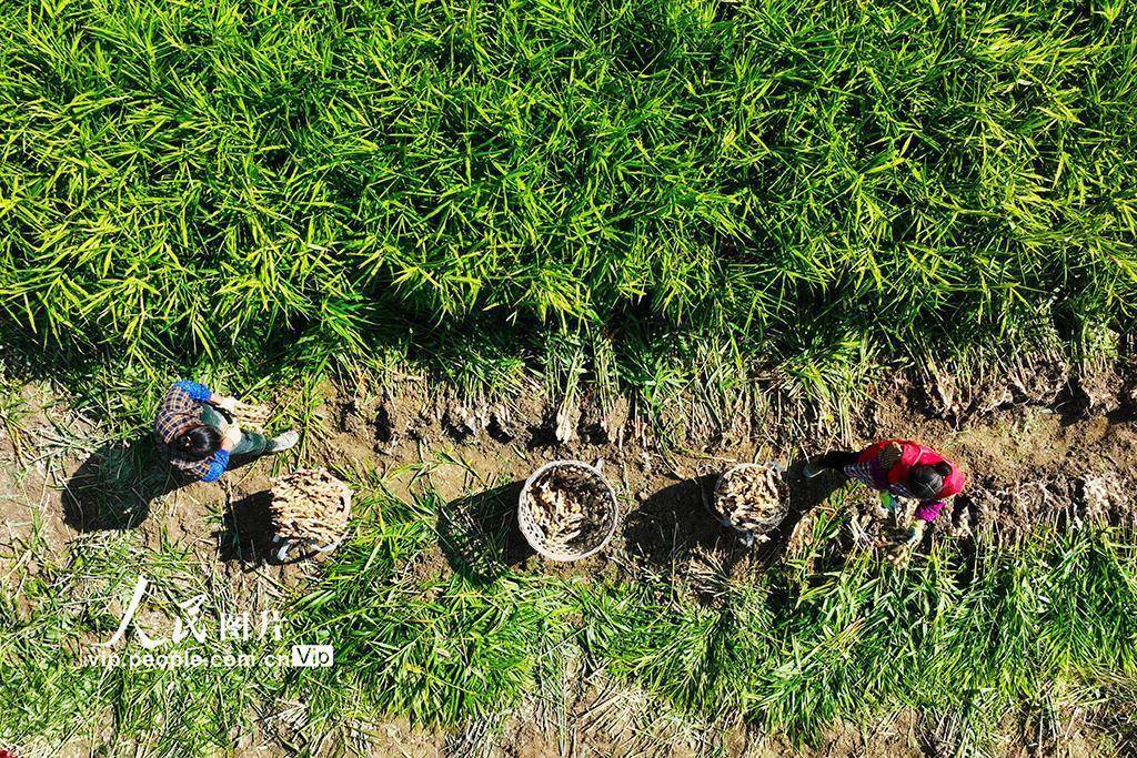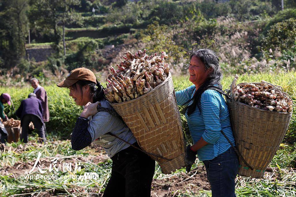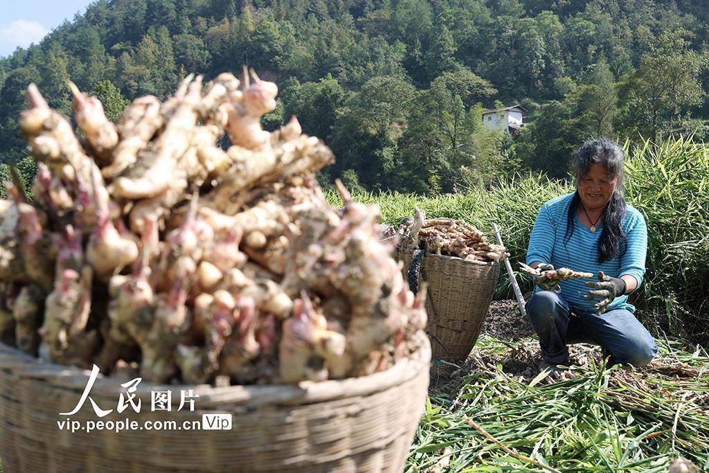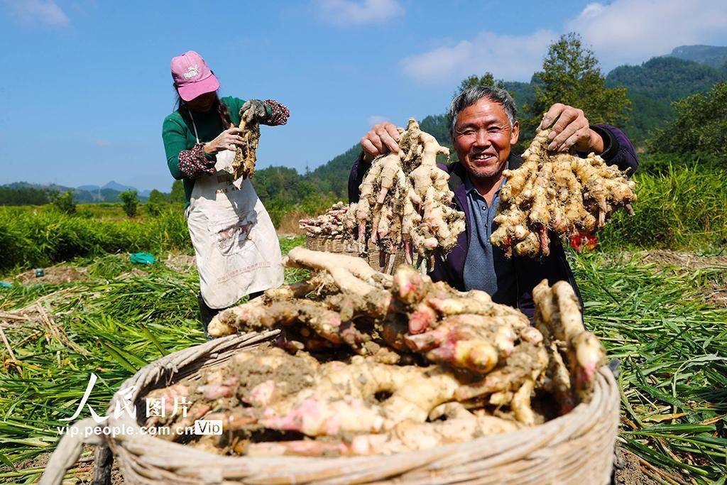 2025年10月28日,村民在重庆市黔江区太极镇金团村富锶生姜基地采挖富锶生姜。