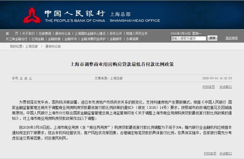 2026年3月16日,中国人民银行上海市分行联合国家金融监督管理总局上海监管局印发《关于调整上海市商业用房购房贷款最低首付款比例政策的通知》,明确自2026年3月16日起,上海市商业用房(含“商住两用房”)购房贷款最低首付款比例调整为不低于30%,此前该比例为不低于50%。